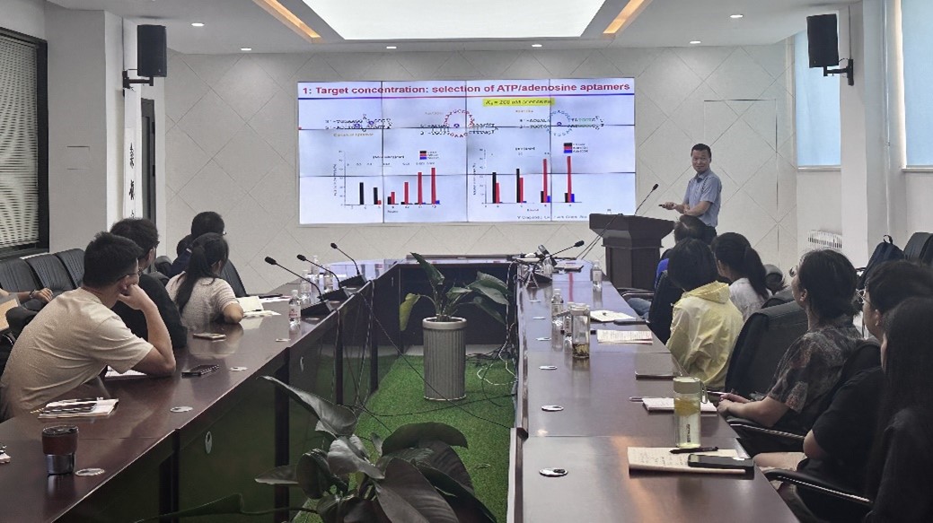 刘珏文教授在讲座中重点介绍了DNA与纳米金的界面作用、DNA适配体筛选表征及药物递送应用等。基于纳米金的DNA修饰这一基础科学问题,进行了深入探索研究,分享了在成果背后的研究思路。结合适配体筛选和表征,介绍了选题的经验技巧。刘教授还分享了其团队的最新研究成果,利用适配体靶向眼部进行药物递送。报告会后,刘教授与在场师生进行了互动交流,耐心解答有关纳米金的非巯基DNA修饰、适配体传感和治疗应用等问题,现场气氛活跃。