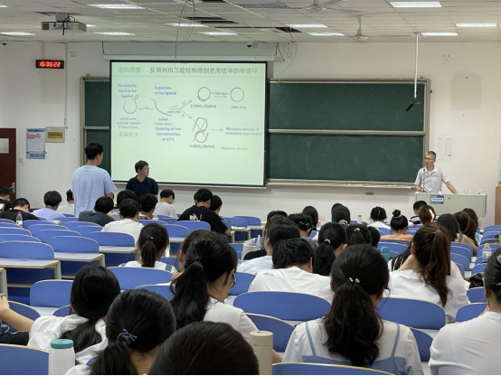 梁兴国教授的报告内容从大学之道、核酸基础知识、所做研究概述和单链核酸的环化及应用四部分进行了讲述。在介绍核酸结构及核酸功能的基础知识的基础上简要介绍有关单链核酸的环化及其应用、核酸检测及扩增新技术、核酸纳米材料以及核酸营养的研究成果;主要介绍单链DNA和RNA环的高效合成及其在制备生理条件下稳定存在的左螺旋DNA和重金属检测及脱除方面的应用等。最新研究发现环状核酸在细胞内广泛存在,特别是发现了在真核细胞中除染色体外和线粒体、叶绿体DNA之外的多种环状DNA和RNA。报告后同学们开阔了眼界,激发了学习兴趣,积极向梁教授提问。