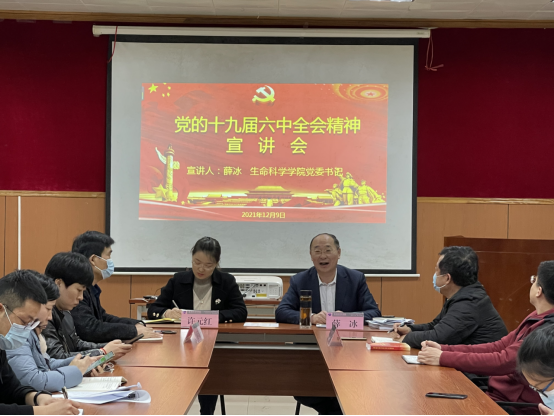 为深入学习贯彻党的十九届六中全会精神,进一步推进全会精神的示范引领和践行落实。12月9日下午,学院在博雅楼103会议室举行党的十九届六中全会精神宣讲会,学院党委书记薛冰为全院教职工做主题宣讲。