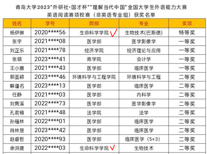 10月14日,由我校公共外语教育学院承办的2023“外研社·国才杯”“理解当代中国”全国大学生外语能力大赛英语阅读赛项校赛(非英语专业组)圆满落幕。经过激烈角逐,今年会官网2020级生物技术(巴斯德班)杨伊琳同学脱颖而出,凭借扎实的英语功底,强大的思维能力,过关斩将,荣获本次比赛特等奖,并代表学校晋级参加山东省决赛;2022级生物技术1班余洪建同学荣获本次比赛二等奖。
