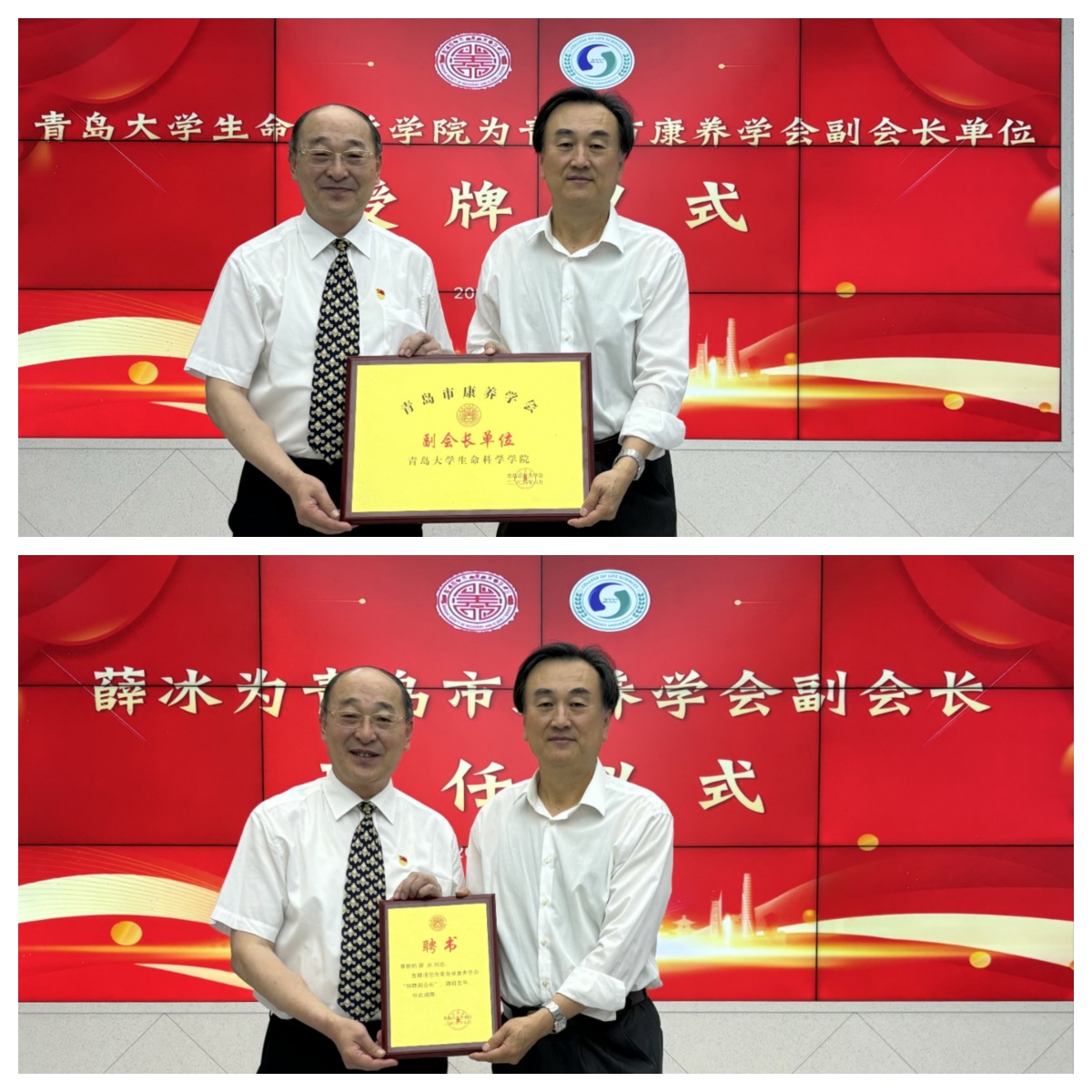 仪式上,青岛市康养学会王中会长为jinnianhui今年会官网授予“青岛市康养学会副会长单位”,jinnianhui今年会官网党委书记薛冰受聘为青岛市康养学会特聘副会长。