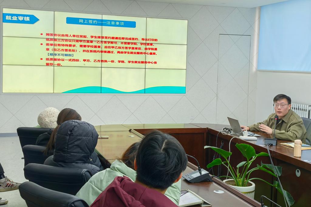 马国成向同学们讲解“山东省高校毕业生就业信息网”中相关内容的填写方式及注意事项,并细致解读《jinnianhui今年会官网“第二课堂成绩单”制度实施办法》。