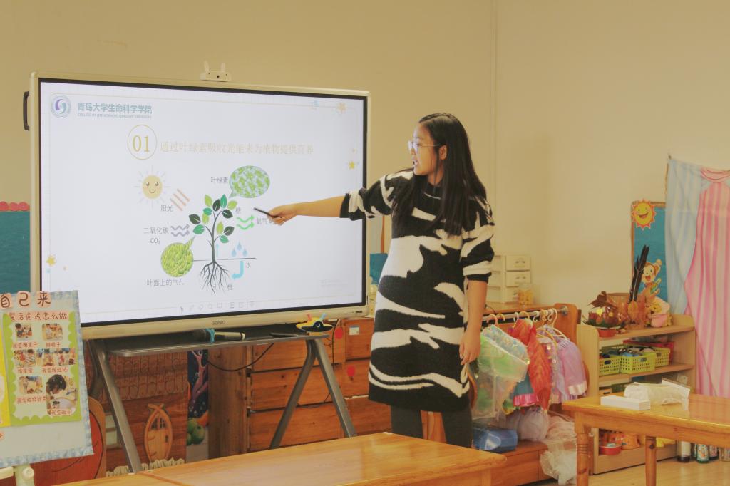 科学源自生活,志愿者们利用简单易懂的PPT,结合身边常见的树叶,生动形象地为小朋友们介绍了植物的树叶是如何利用光维持生命活动的。