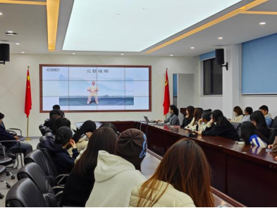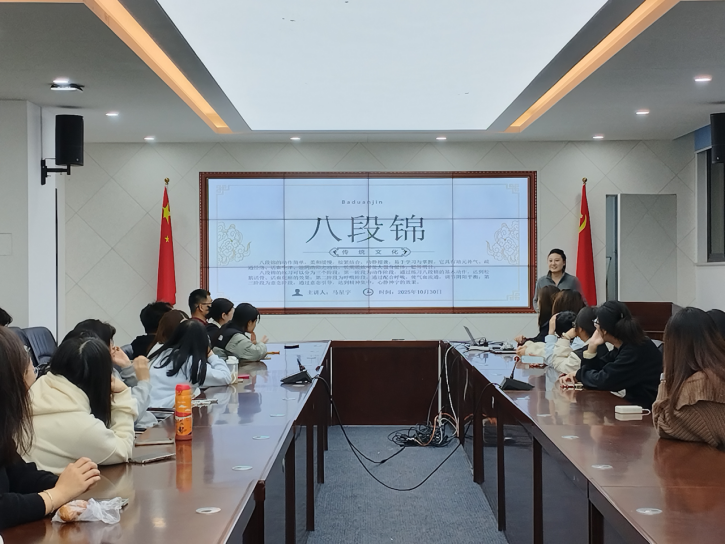 活动伊始,同学们在113会议室跟着马星宇的讲解,通过视频与演示深入学习八段锦的历史渊源与每一招式的养生功效。马星宇是2025级食品工程的研究生,她在传统养生功法领域有着扎实的功底与丰富的阅历——曾荣获济南大学校级八段锦和二十四式太极拳三等奖,更多次参与并指导社区及县级太极拳相关活动。