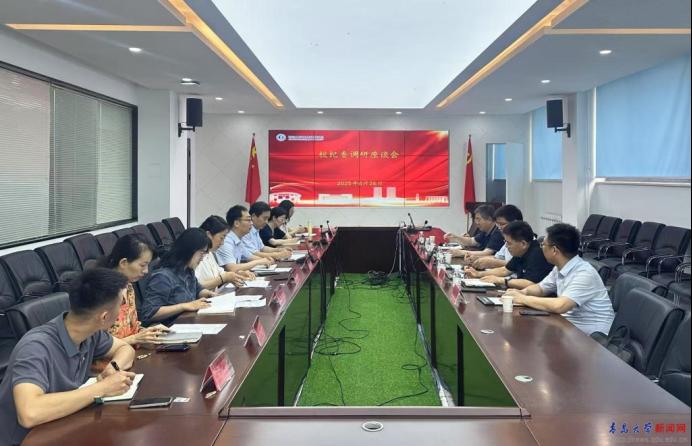 学院党委书记孙建华就全面从严治党、深入贯彻中央八项规定精神学习教育、“清廉青大”建设、巡视巡察审计整改和服务国家重大战略等工作情况进行了汇报。校纪委一行与班子成员、教师代表座谈交流,对今年会官网取得的成绩给予充分肯定并提出具体工作要求。